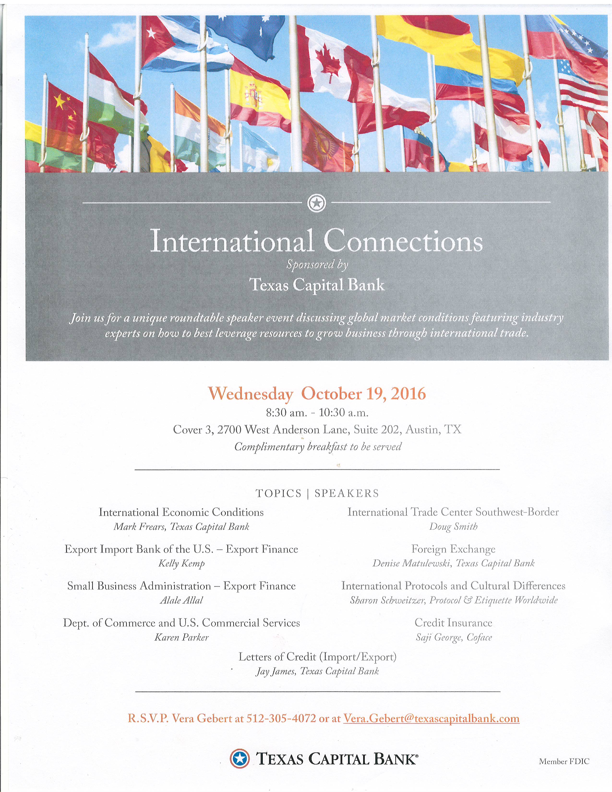 Roundtable speaker event discussing global market conditions featuring industry experts on how to best leverage resources to grow business through international trade.
